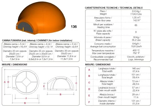 Kapacitet till att laga fyra till åtta pizzor i taget och till att baka 8 till 16 kg bröd på en gång, beroende på storlek. Levereras med en termometer och en dörr med trähandtag. Pris 88400 kr.